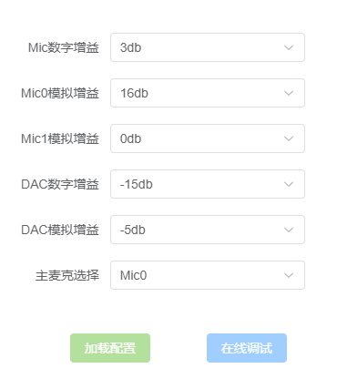 Mic0 模拟增益 : 芯片内部MIC电路的放大电路模拟增益控制,设置范围为[0dB, 32dB],根据使用的麦克风灵敏度大小去调整增益,MIC0一般用于人声采集, 常用的硅MIC的模拟增益建议设置为“16dB”。