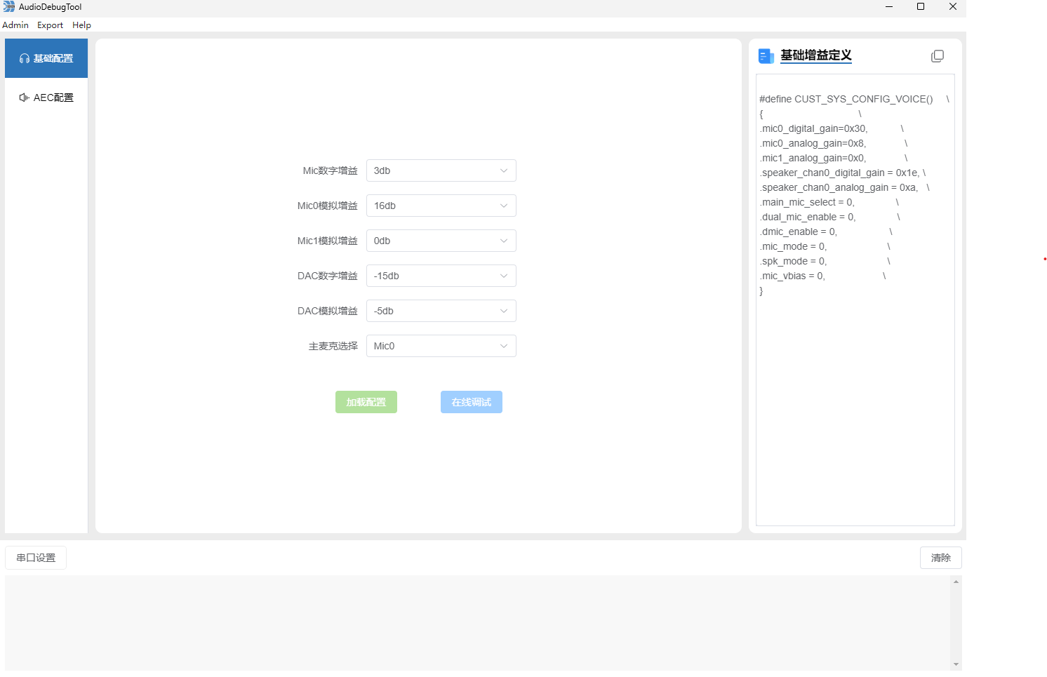启动软件后,软件整体分为工具栏、功能模块、串口栏三个部分,功能模块目前包含基础配置和AEC配置 ,界面如下图所示
