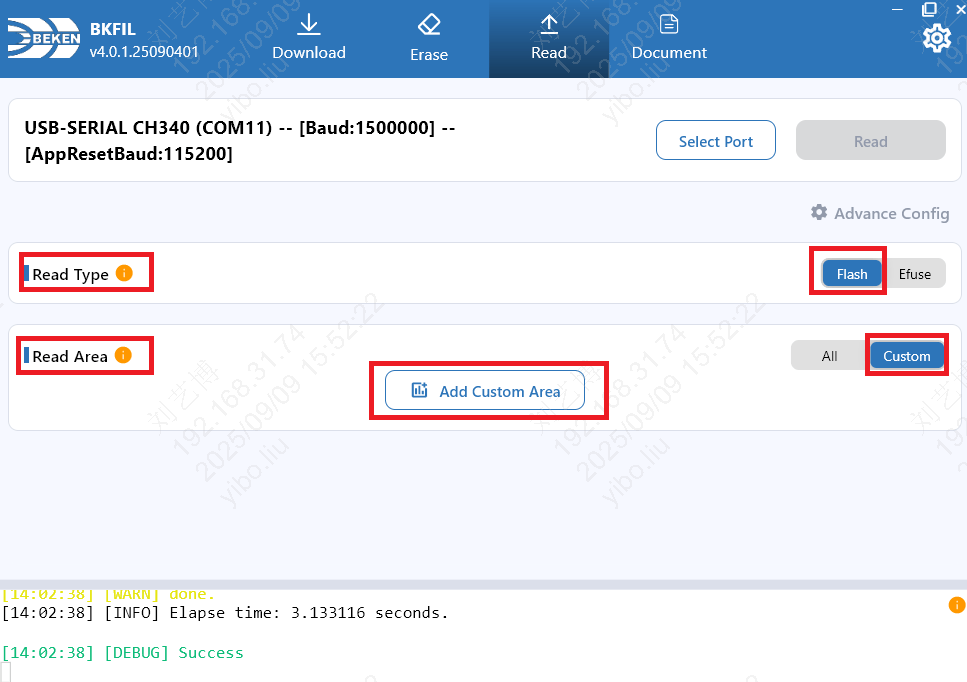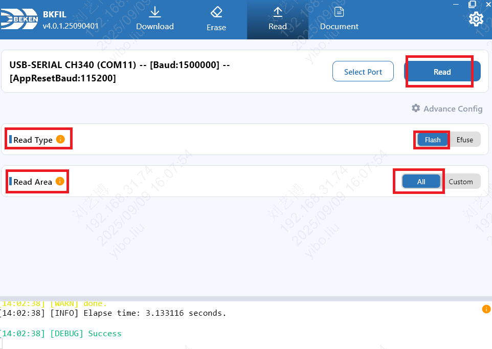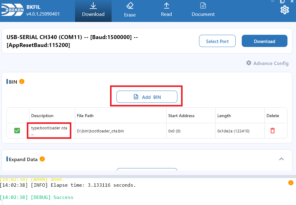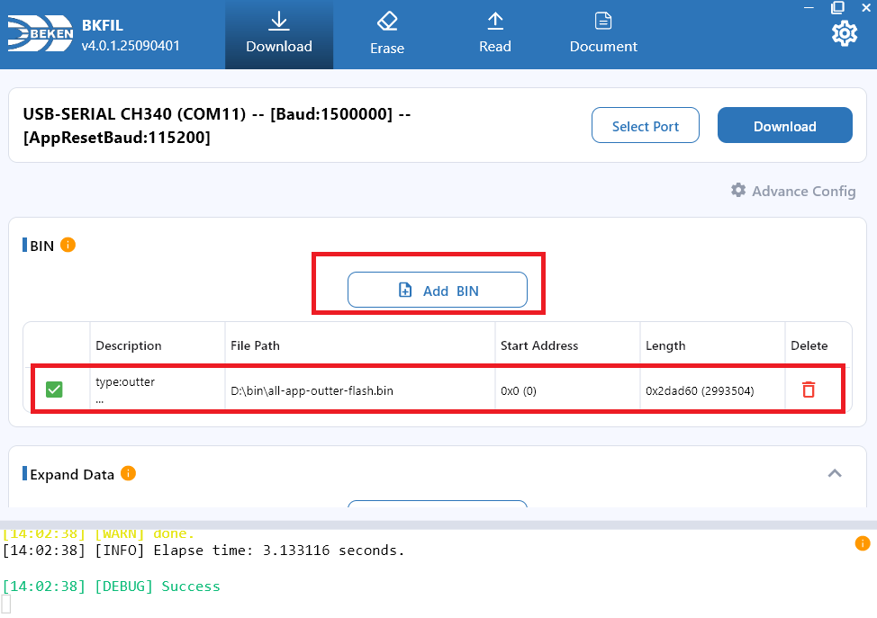 使用CLI .\bk_loader.exe download -p COM11 -b 1500000