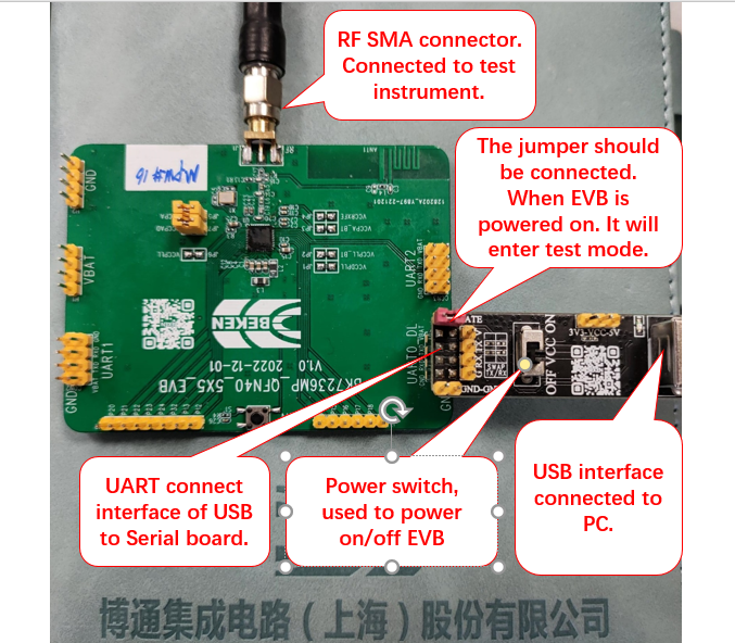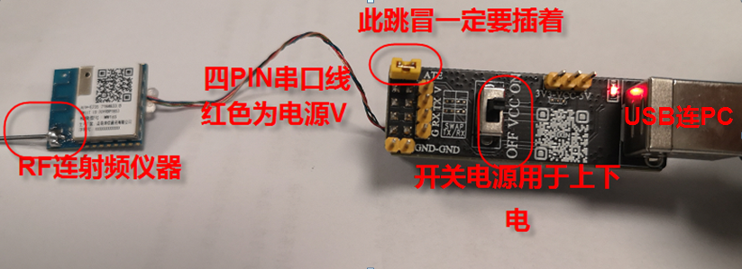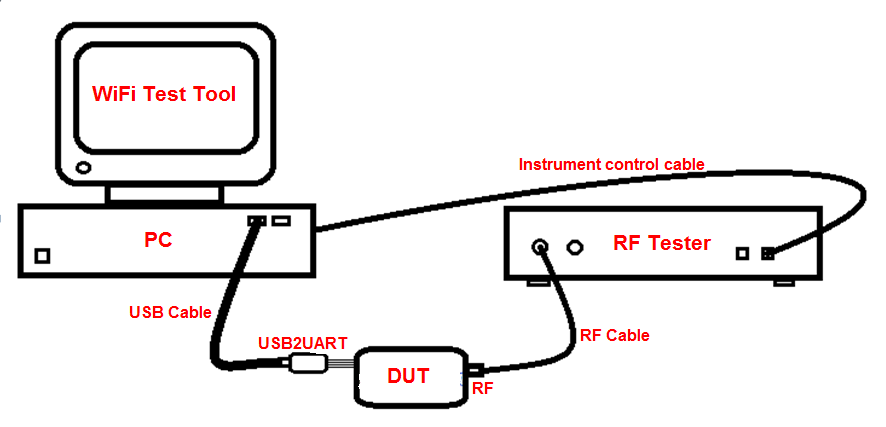 The hardware connection of the RF DUT module is shown in the figure: the DUT is connected to PC through a USB to serial cable, and the RF port at the other end is connected to the RF tester via the RF cable. The PC uses “WiFi Test Tool” to control the DUT, and also controls the instrument to measure the RF performance.