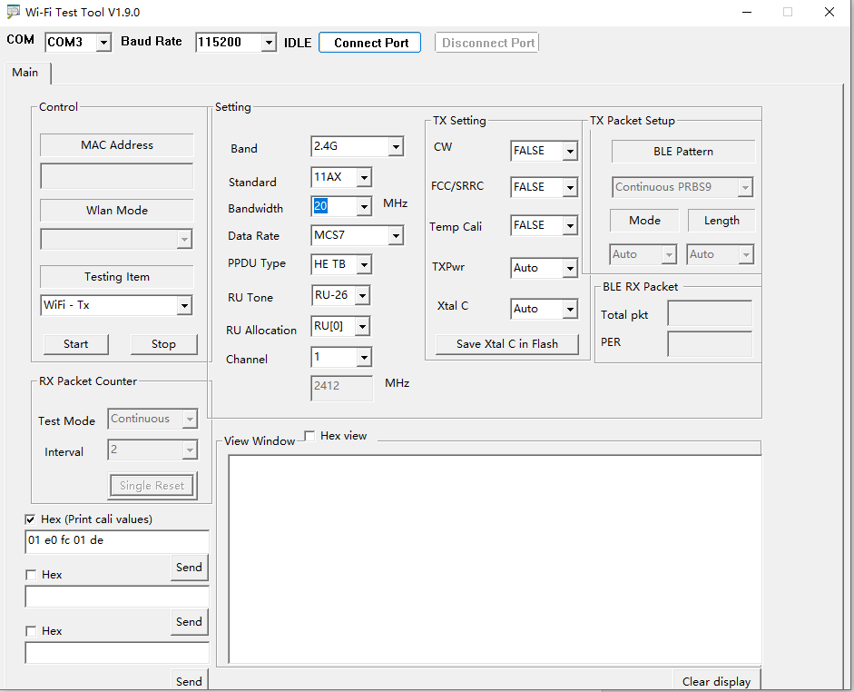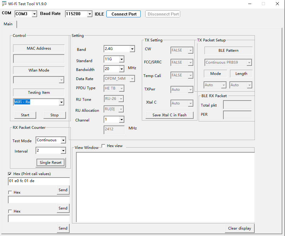 “Single” mode: click “Single Reset” first, then the instrument sends a fixed package (such as 1000bytes), then look at the number of 227 in the “View Window” box, and divide the correct number of packets received by the total number of packets sent by the instrument to get the correct rate value.