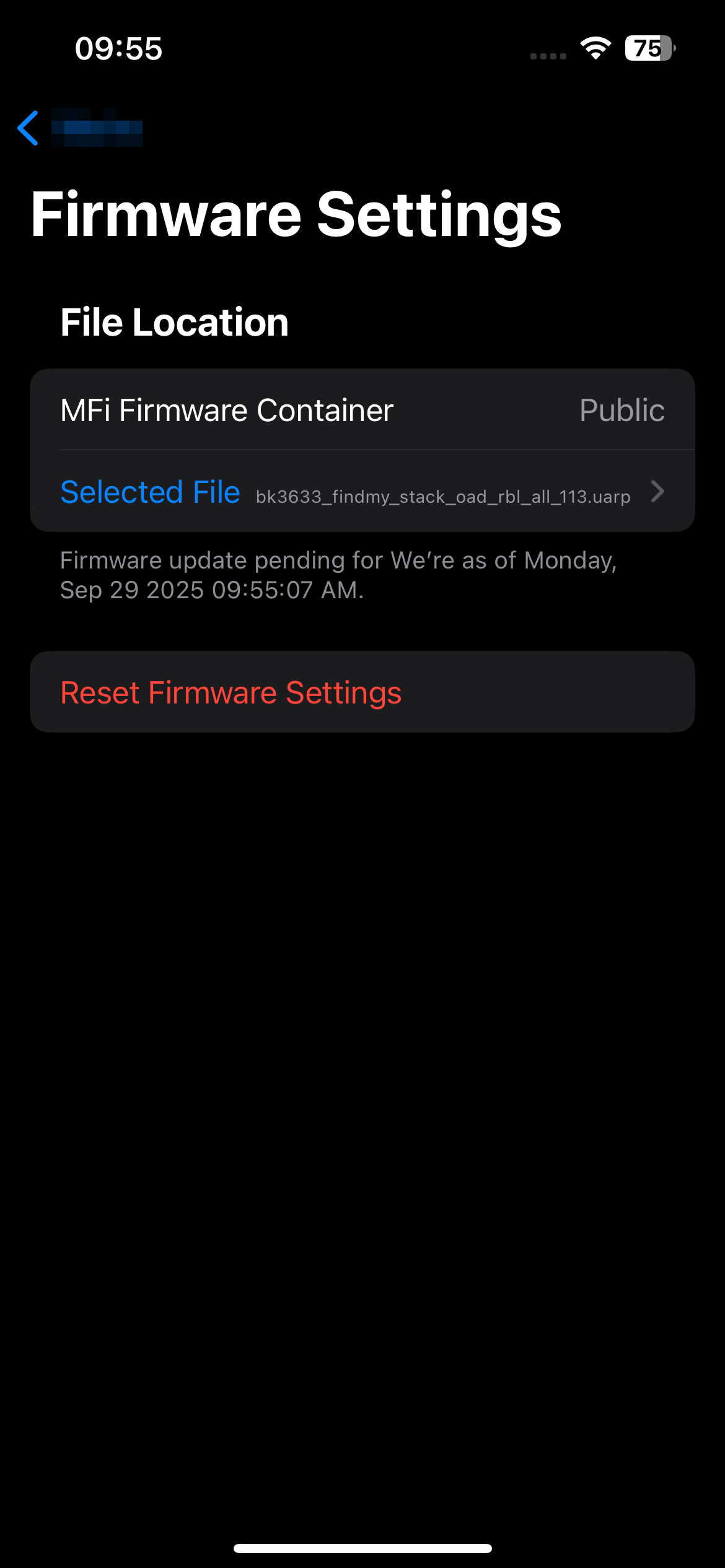 通过 “Find My” 添加设备后,打开FMCA应用,进入 ”Firmware Settings“ ,通过 “Choose a File” 选择升级的uarp文件,