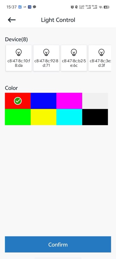 在灯光控制页面,选择要设置的灯光颜色后,点击 Confirm ,设备的 控制指示灯 会修改为设置的颜色。如下图。