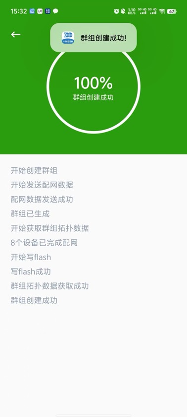 App中会显示当前的流程状态,当所有设备都配网完成,App端提示: 群组创建成功 ,并返回到群组列表页面。如下图。
